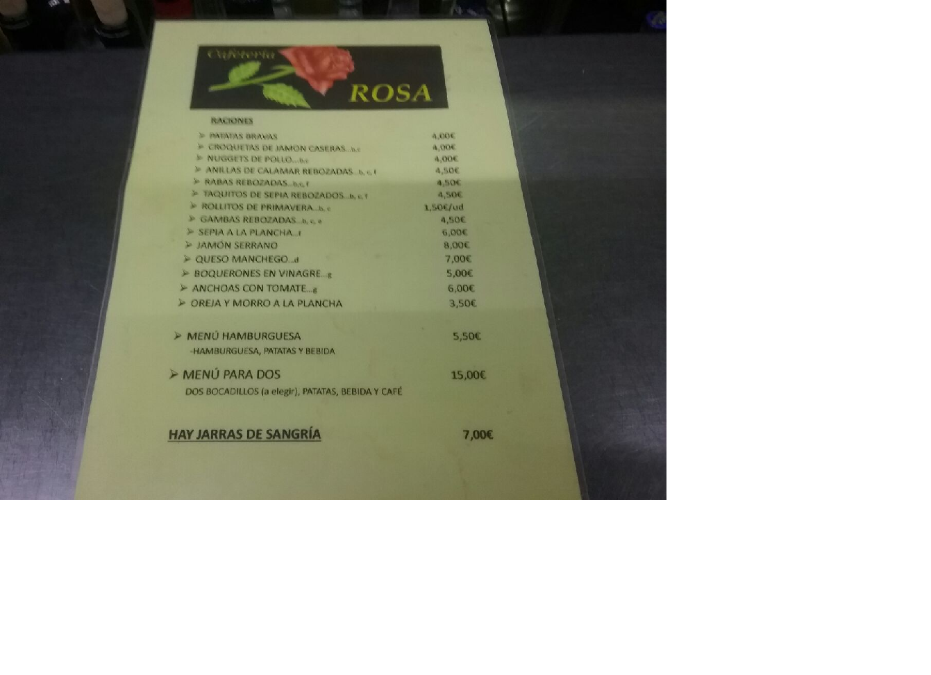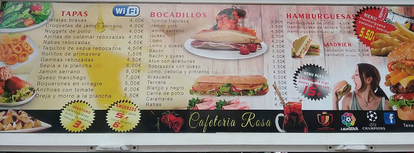 EN LA CAFETERÍA ROSA DE CULLERA HACEMOS DESAYUNOS POPULARES CAFÉ CON LECHE MAS ZUMO DE NARANJA NATURAL DE CULLERA TOSTADA CON TOMATE O CON MANTEQUILLA Y MERMELADA O CON ACEITE Y SAL POR SOLO 3€ DESDE LAS 8H ASTA LAS 12H TAMBIÉN HACEMOS ALMUERZOS POPULARES BOCADILLO MAS OLIVAS CACAHUETES Y BEBIDA CON CAFÉ POR TAN SOLO 5€ MÁS BOCADILLOS ESPECIALES POR TAN SÓLO 7€ DESDE LAS 9H ASTA LAS 12H OS ESPERAMOS TAMBIÉN HACEMOS MENÚ DE HAMBURGUESAS VARIADAS MIXTA DE POLLO DE TERNERA O DE BUEY Y TODAS LAS HAMBURGUESA LLEVAN BACON QUESO LECHUGA TOMATE Y HUEVO CON PATATAS MÁS BEBIDA POR TAN 9€ TODAS LAS HAMBURGUESAS PESAN SOBRE 180GRS Y 200GRS UNA SELECCIÓN DE PLATOS DE PICADA